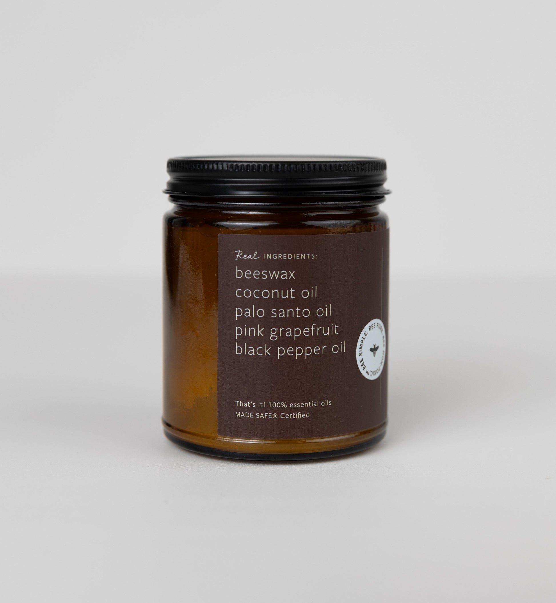 Cocus Nucifera (coconut oil), Apis Mellifeca (beeswax), BURSERA GRAVEOLENS (steam distilled palo santo oil), CITRUS PARADISI (distilled pink grapefruit peel), PIPER NIGRUM (black pepper oil).