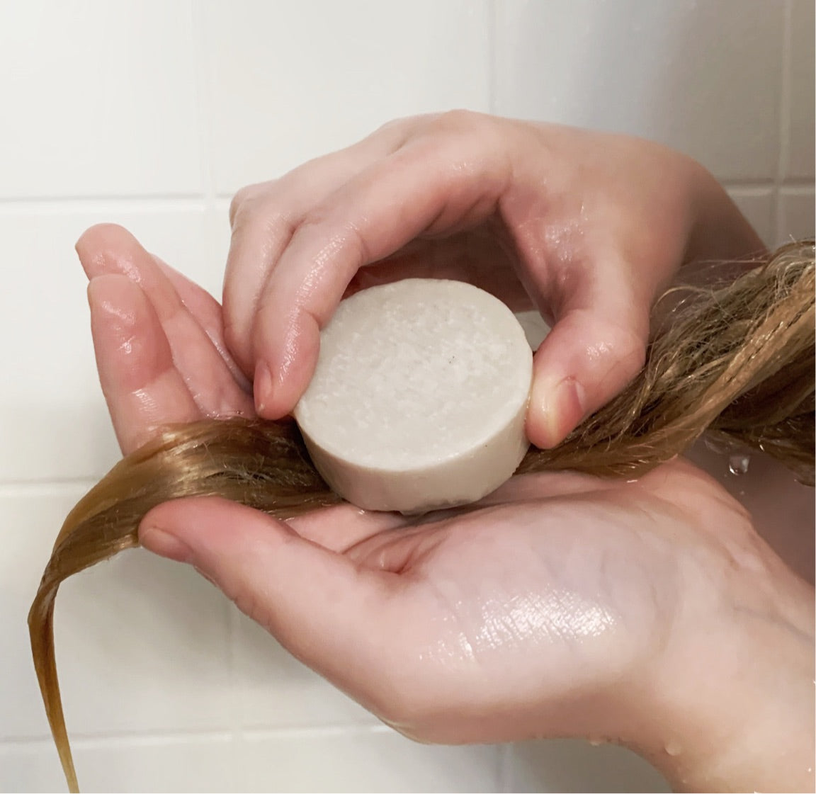 After shampooing, rub conditioner bar directly onto wet hair, focusing on the ends. If you have longer hair, you can pull it over one shoulder and "paint" the ends of your hair with the conditioner bar.