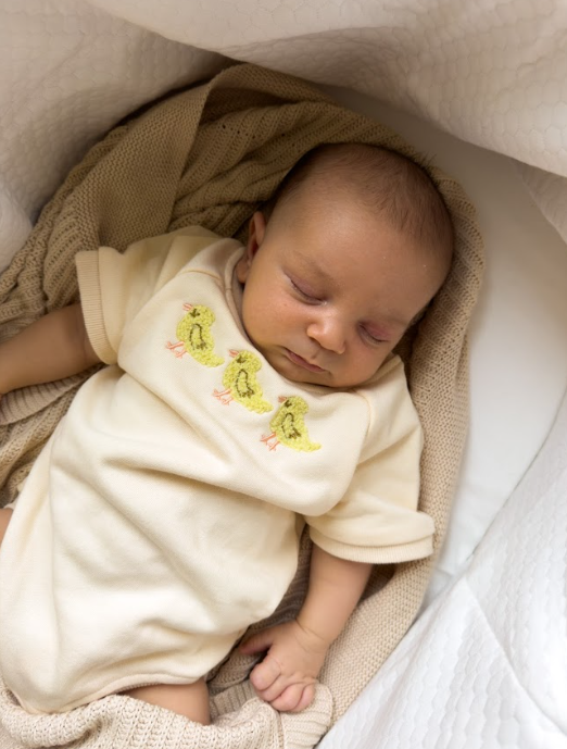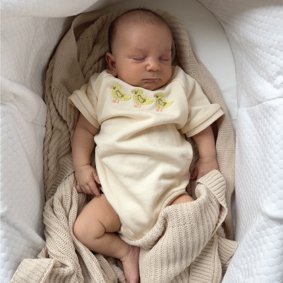 This charming Luna + Luca baby romper features an adorable chenille applique of three playful ducklings. The ducklings, rendered in soft, plush chenille, are depicted in pale yellow with tiny embroidered details. With their fluffy feathers, tiny beaks, and little feet, they adorably waddle just the same as your little duckling!