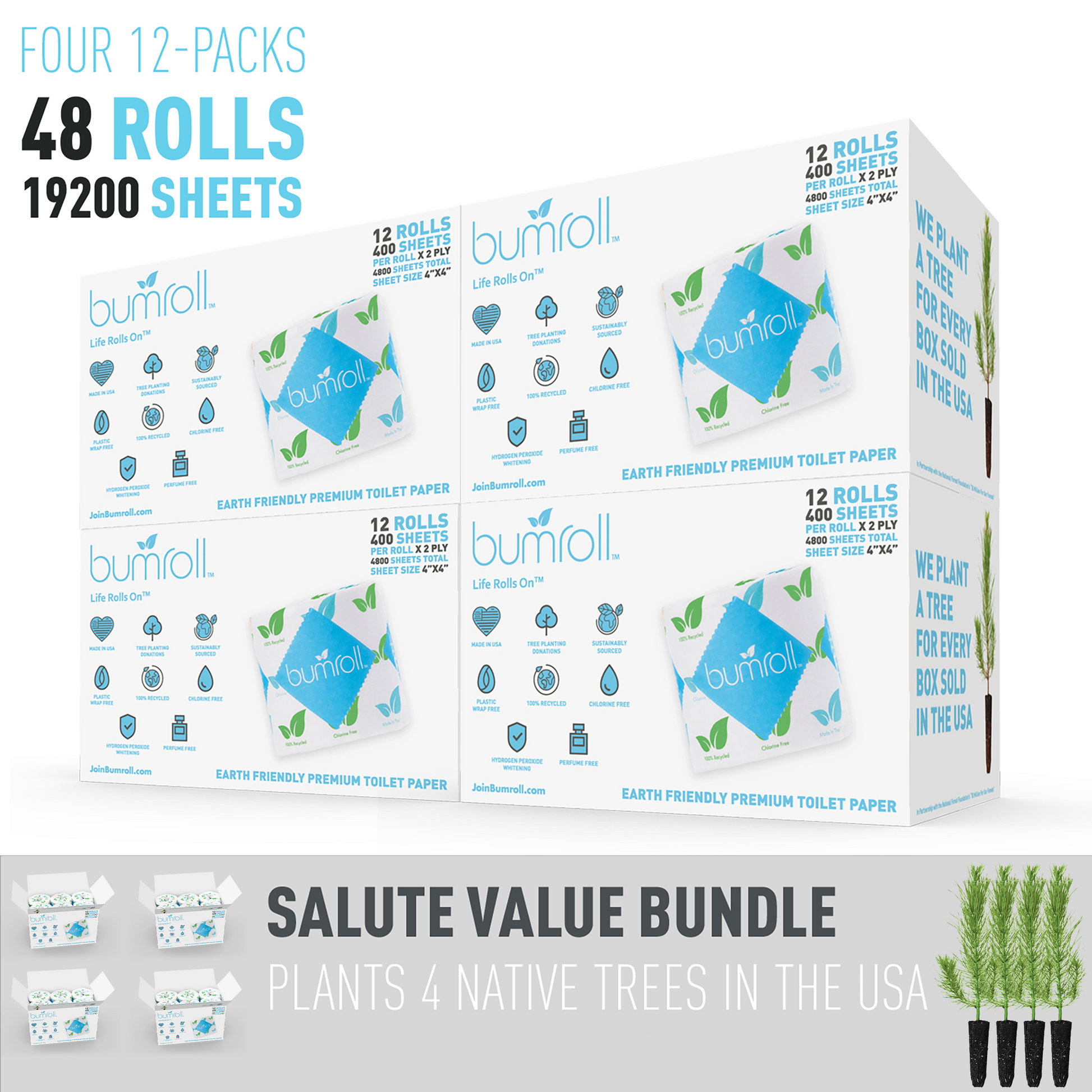 Bumrolls are Recycled and Sustainable. They come with 400 sheets per roll that are 2 Ply and they are available in 12, 24, 36, 48, 72, or 96 Rolls a Case. Bumrolls are Chlorine Free, PFOA, PHOS Free, Plastic Wrap Free Bath Tissue. Bumrolls are Ethically Made In the USA to help to support American jobs. You get 4 x 4 inch sheets with Bumroll and 2-ply layers of softness & strength with 400 sustainably sourced sheets per roll that are made in the USA. Bumroll supports local communities in California with manufacturing jobs, and we reinvest in our forests by planting trees with our partner the National Forest Foundation's “Holistic Reforestation” campaign. Bumroll helps to support American Jobs, Plant Trees In The USA, and are:
