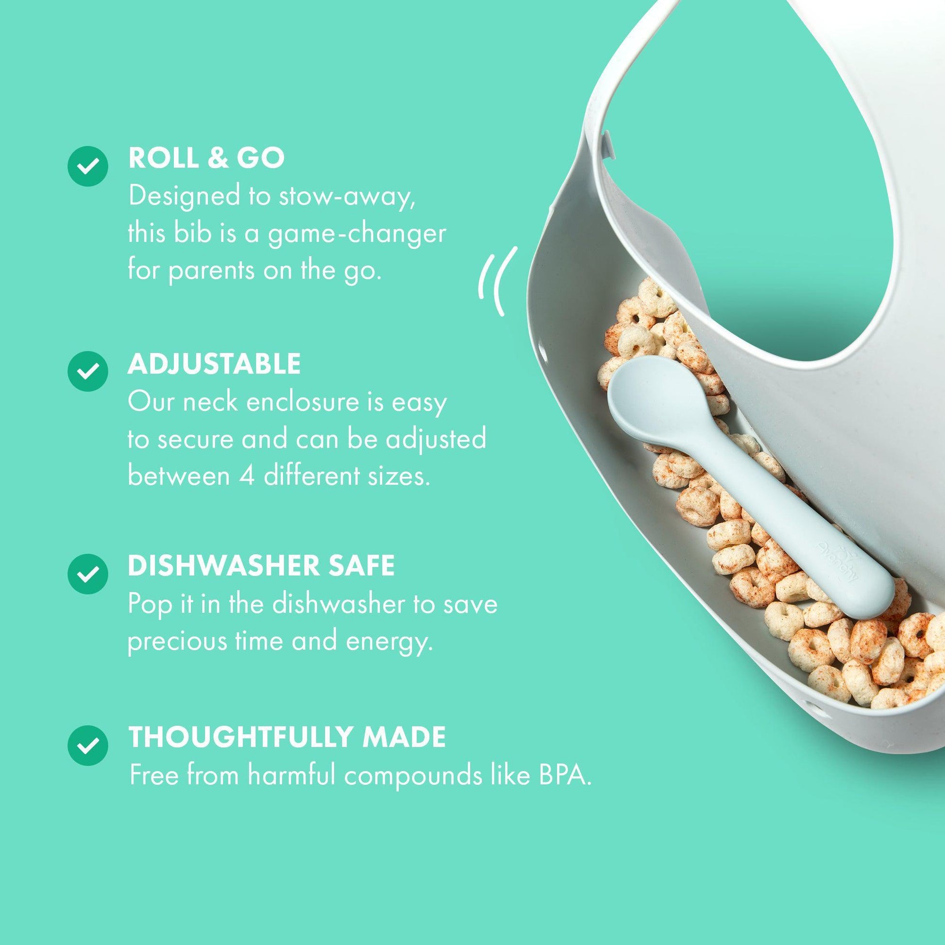 Discover Avanchy's unique Roll & Go Silicone Bibs Gift Set. Includes a rollable bib with a food compartment, matching spoon, and your choice of a mini bamboo or silicone bowl. Perfect for busy parents, this eco-friendly, compact set fits easily in your diaper bag. Make mealtime mobile with Avanchy.